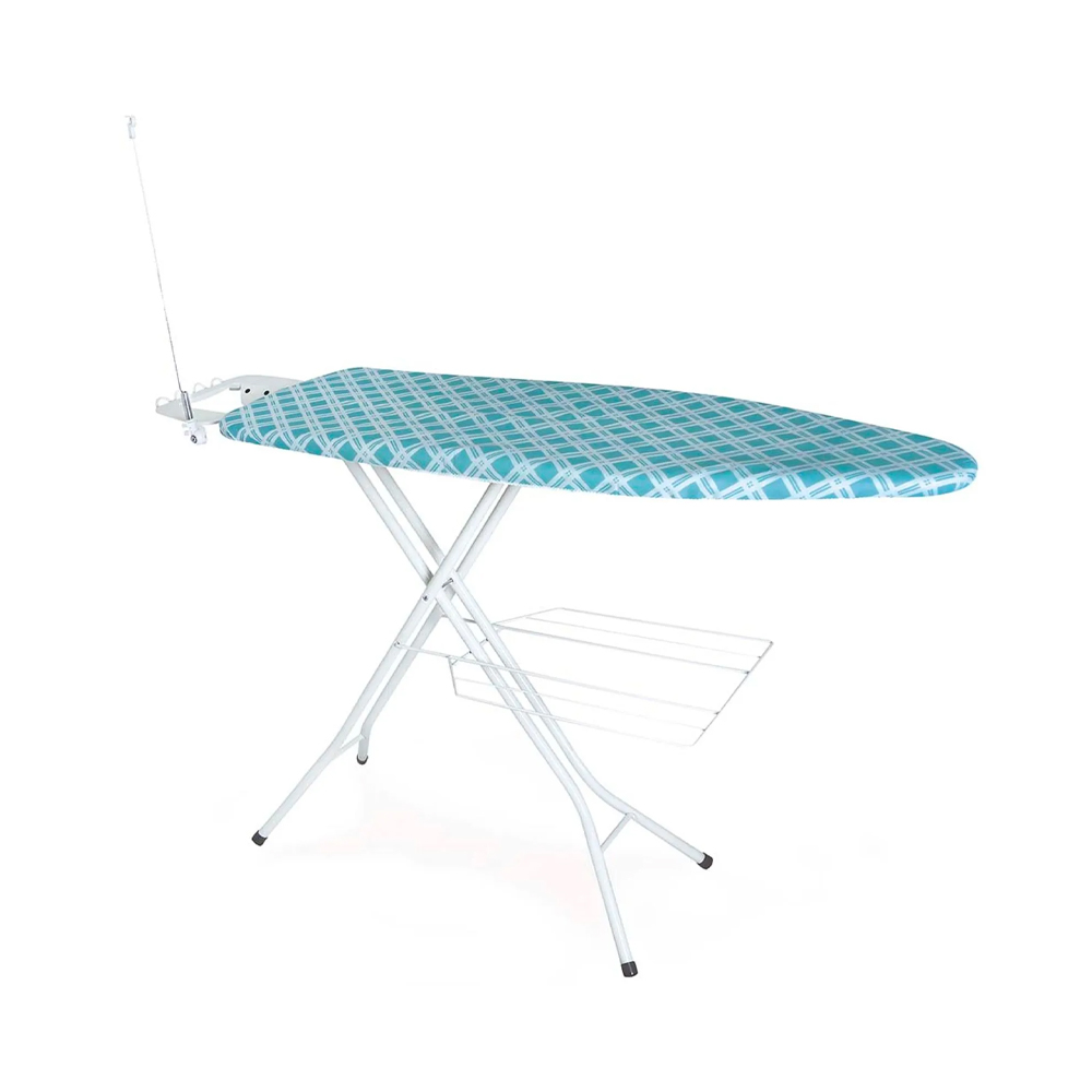 A Mesa de Passar Viena traz charme e praticidade para a lavanderia, com suporte para roupas passadas, porta-cabides lateral e haste esticadora do cabo do ferro, garantindo mais segurança. Possui cinco níveis de altura, trava de segurança e estrutura dobrável em tubo de aço com pintura epóxi branca, além de tampo em tela expandida.